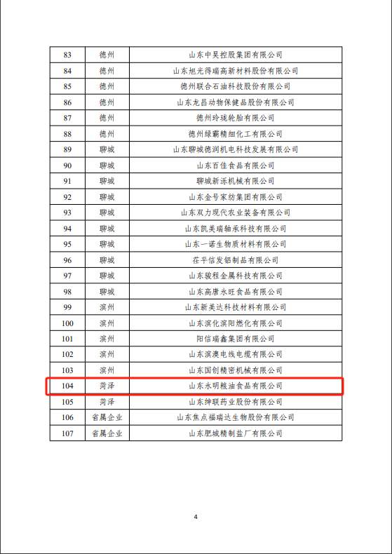 根據(jù)《技術(shù)創(chuàng)新示范企業(yè)認(rèn)定管理辦法(試行)》(工信部聯(lián)科〔2010〕540號)和《山東省工業(yè)和信息化廳關(guān)于組織開展2023年國家技術(shù)創(chuàng)新示范企業(yè)認(rèn)定、復(fù)核評價及省級技術(shù)創(chuàng)新示范企業(yè)認(rèn)定、復(fù)核評價工作的通知》要求,經(jīng)有關(guān)單位推薦、專家論證和公示等程序,山東永明糧油食品集團(tuán)有限公司被山東省工業(yè)和信息化廳認(rèn)定為2023年山東省技術(shù)創(chuàng)新示范企業(yè)。